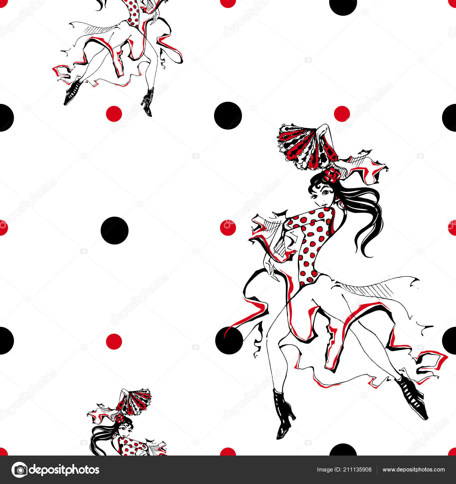 Girl Dancing Flamenco Seamless Pattern Gypsy Polka Dot Background White Stock Vector C Grigaolga 211135908