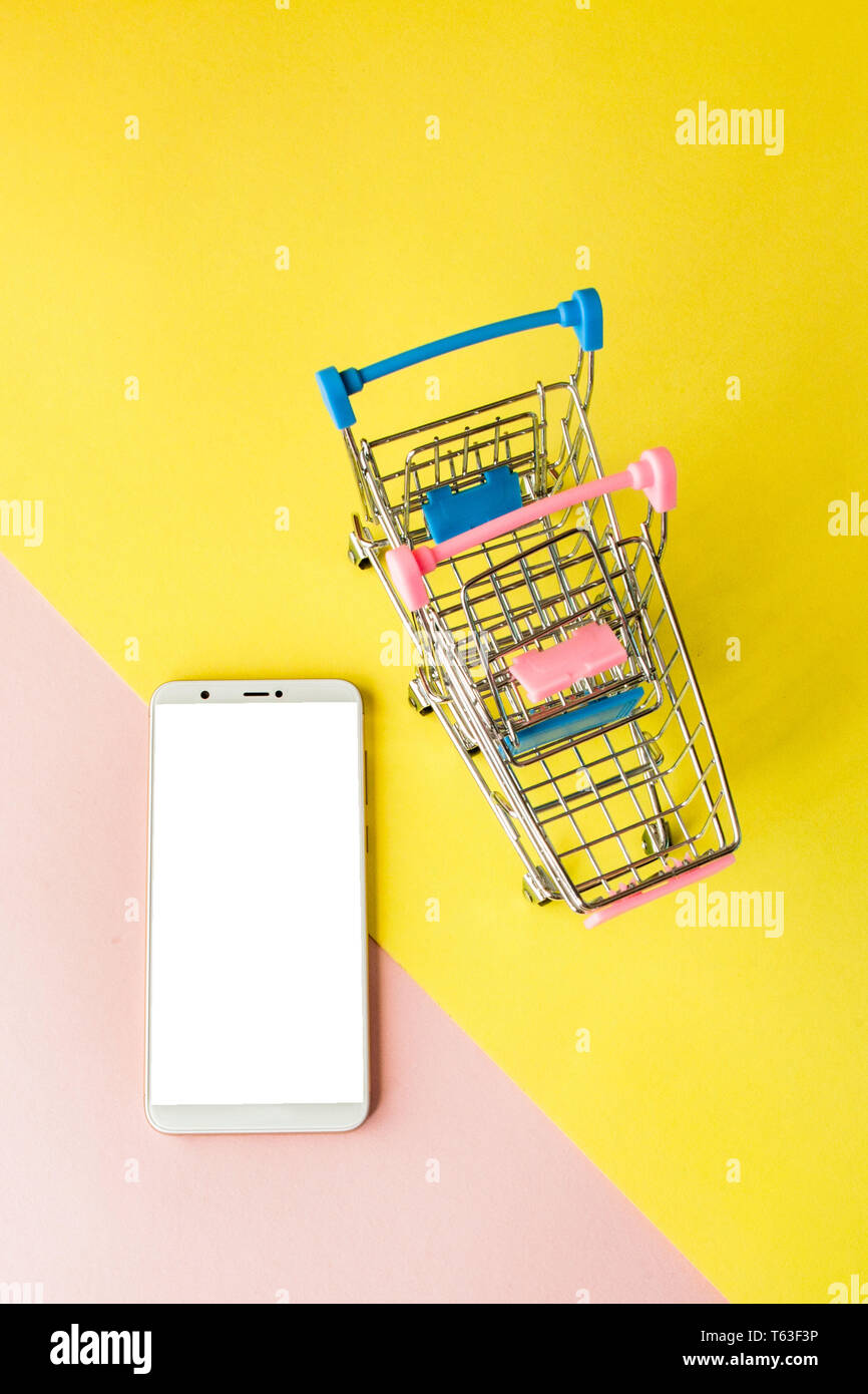 Pantalla En Blanco Blanco Celular Y Shopping Carts En Rosa Pastel Y Fondo Amarillo Estilo Minimalista Flatlay Fotografia De Stock Alamy